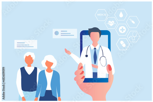 Online consultation, virtual doctor for elderly. Doctor examining senior couple health. Medical and healthcare innovation technology vector illustration
