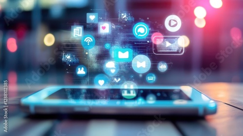 Online digital transformation, smartphone screen displaying futuristic social media engagement symbols