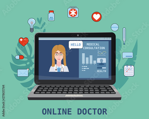 Online doctor women healthcare concept icon set. Doctor videocalling on a laptop