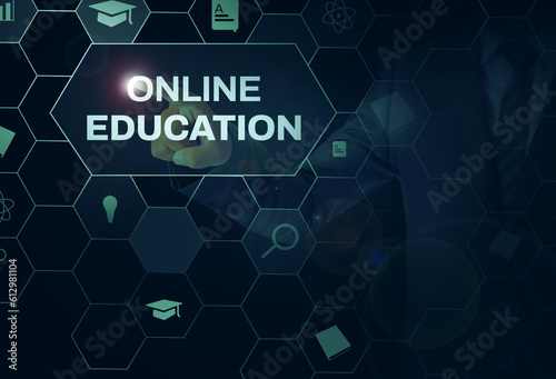 Online Education concept background with man touching the screen. Digital education concept backdrop
