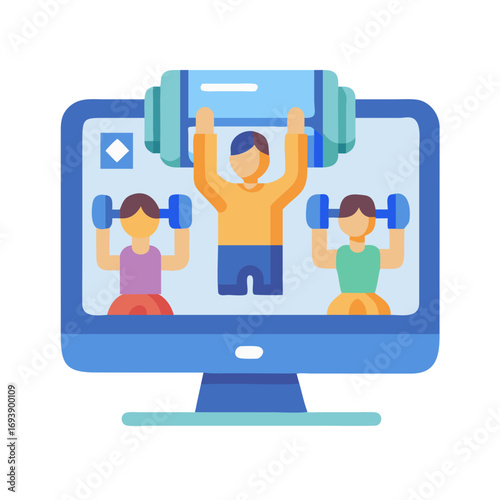 online, fitness, class, instructor, participant, lifting, weight, computer, screen, monitor, exercise, virtual, remote, physical exercise, training, digital, technology, education, home, sport, healthy, lifestyle, tutorial, demonstration, guidance, strength, activity, dumbbell, coaching, wellness, video, conference, platform, program, lesson, web, cyberspace, modern, communication