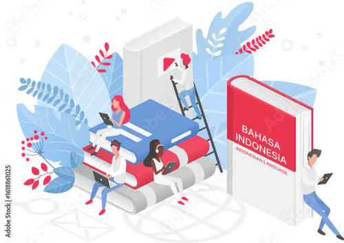 Online Indonesian language courses isometric 3d illustration. Distance education, remote school, Indonesia university. Language Internet class, students reading books. Teaching foreign languages.