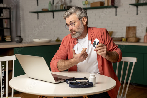 Online medical consultation for diabetic patient man with glucometer via laptop