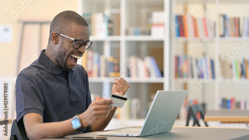 Online Payment Success by Young African Man on Laptop in Office