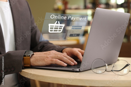 Online payment system interface over computer. Man working on laptop at table, closeup