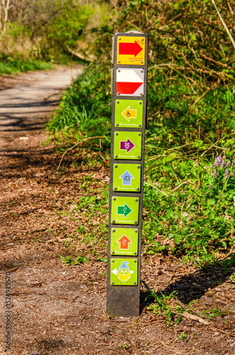 Oostvoorne, The Netherlands, April 4, 2025: pole next to a footpath in the dunes, with a multitude of hiking routes