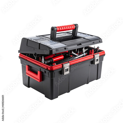 toolbox, tool, open, equipment, construction, black, red, handle, metal, plastic, assortment, hardware, repair, maintenance, workshop, instrument, manual, wrench, screwdriver, plier, hammer, utility, kit, container, organisation, storage, handyman, professional, domestic, home improvement