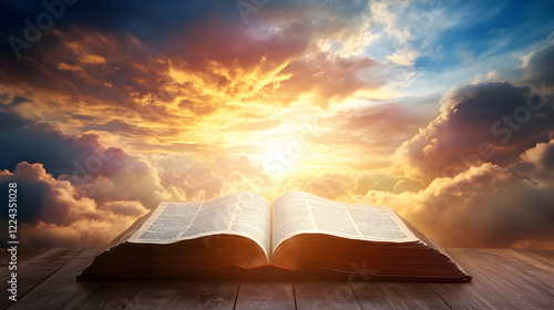 Open Bible Set Against Majestic Sunrise with Dramatic Clouds and Golden Rays : Generative AI