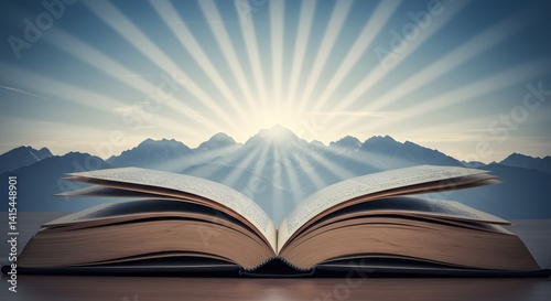 book, open, reading, learning, mountain, sunrise, page, text, desk, table, sun, ray, light, peak, range, landscape, sky, view, distance, horizon, paper, education, concept, cognition, story, adventure, travel, escape, day, journey, scene, serene, calm, study, quiet, inspiration, academic, leisure, literacy, daylight, foreground, fiction, non-fiction, creative, literature, wisdom, storytelling