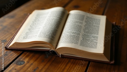 Open book resting on wooden table, showcasing pages filled with text in soft natural light