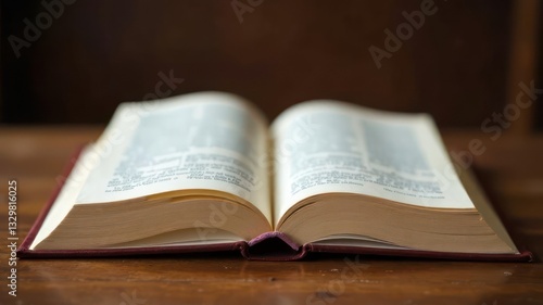 open book resting on wooden table with pages visible. concept of knowledge, education, learning. study, literature, academic research, library
