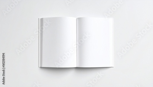Open book with blank cream pages on white surface, top-down minimal composition with calm and neutral tone.
