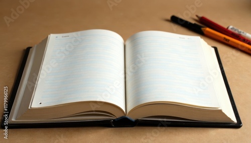 Open exercise book with pencils on brown background spread wide, learning tools, office supplies, paper