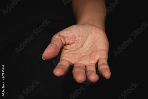 Open hands of wrinkled middle-aged woman praying for God's blessing on black background.