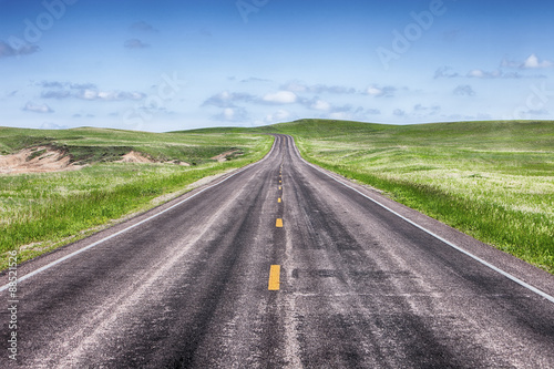 highway, road, asphalt, country, rural, grass-land, green, grass, yellow, stripes, striped, line, median, hill, landscape, scenic, colours, colours, colours, colours, horizon, vanishing point, distant, distance, empty, open, badlands, national park, dakota, nobody, no one, no people, horizontal, color image