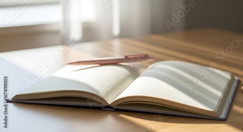 Open Notebook with Pen on Wooden Table, Lit by Soft Sunlight – Blank Pages Ready