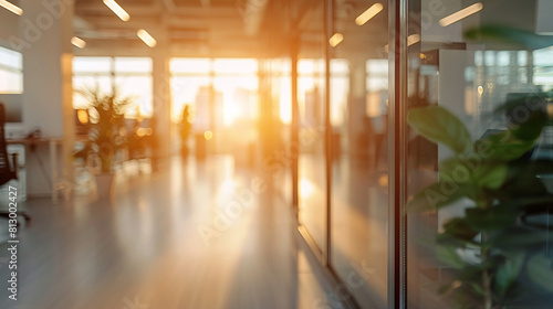 Open plan business office vacant with gentle ambient light casting a tranquil glow creating a soft blurred and welcoming ambiance