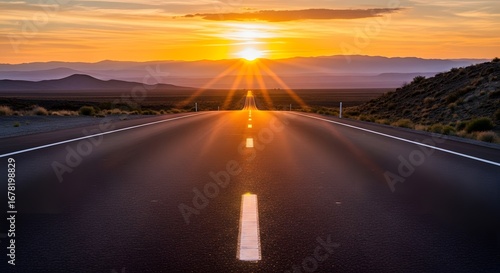 Open road stretching towards a vibrant sunset with sunburst rays over distant mountains and a clear asphalt highway