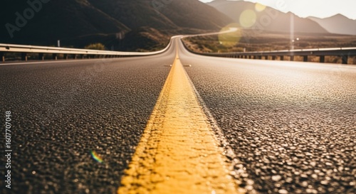 road, asphalt, highway, mountain, sunlight, yellow, line, perspective, travel, journey, horizon, landscape, sun, sky, adventure, destination, freedom, empty, open, straight, forward, distance, ahead, glare, nature, outdoors, scene, view, leading, vanishing, point, converge, surface, texture, pattern, curve, incline, ascent, gradient, vista, picturesque, scenic, transport, vehicular, way, passage, route, path