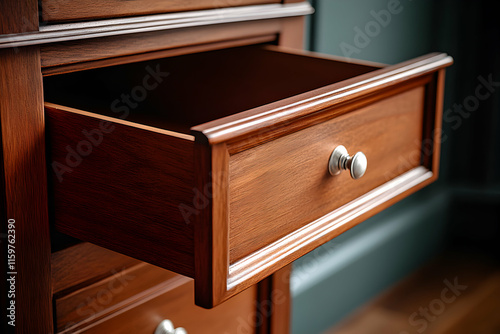 Open wooden drawer of a classic dresser showcasing rich mahogany wood grain and elegant silver knobs; close-up detail shot.