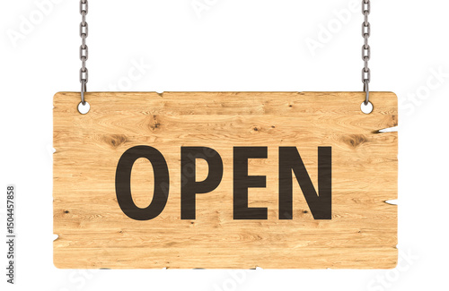 OPEN Wooden Sign Hanging on Chains, 3D Rendering isolated on transparent background