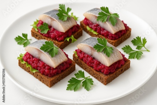 Open-faced sandwiches featuring herring and beetroot on a plate