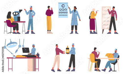 Ophthalmologist patients. Optical professional consultant. Doctor examining eyes. People check their eyesight and pick up glasses. Optometry diagnostic and surgery. png medical set