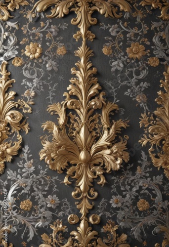 Opulent baroque wallpaper; gold, silver scrolls, floral damask, vintage elegance, texture, baroque