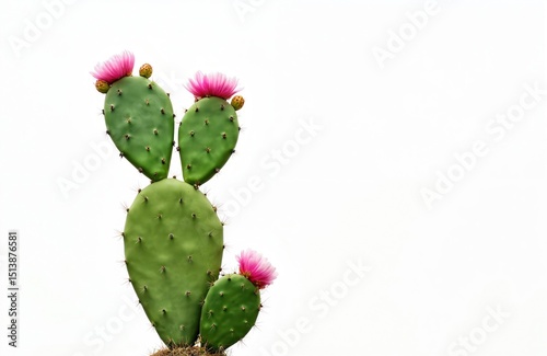Opuntia cochenillifera cactus blooms pink flowers. Green prickly pear cactus grows in botanical garden. Cactus spines detail on white background. Botanical illustration of Cactaceae succulent plant.