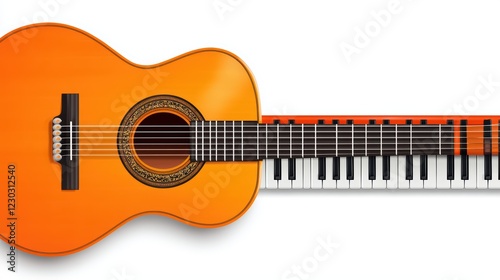 Orange Acoustic Guitar and Piano Keyboard Fusion on White Background