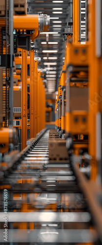 Orange and grey conveyor belts, boxes moving, industrial, automation, efficiency, modern manufacturing, futuristic technology.