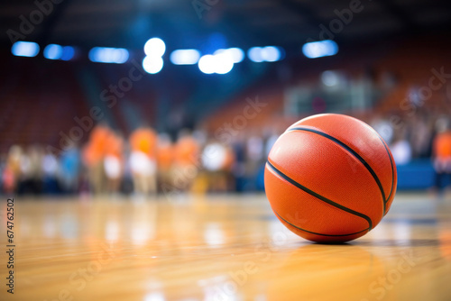 Orange ball on basketball court with stadium as background. Basketball game championship