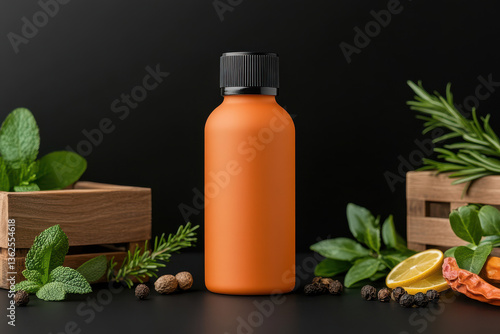 orange, bottle, herb, spice, black, background, mint, rosemary, lemon, pepper, cardboard box, container, natural, organic, fresh, culinary, ingredient, health, wellness, aromatic, leafy, green, cookery, seasoning, herbal, citrous, wooden, tray, kitchen, isolated, product, branding, design, essential, oil, vegan, vegetarian, decor, lifestyle, vibrant, greenery, high-coloured