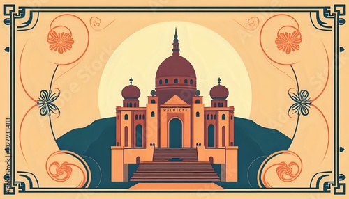 Orange Dome Building with Clock Face and Blue Door, Hilltop Landscape with Mountains and Flowers