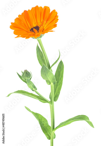 Orange edible flower of Calendula officinalis isolated on a white background. Marigold flower with leaves.