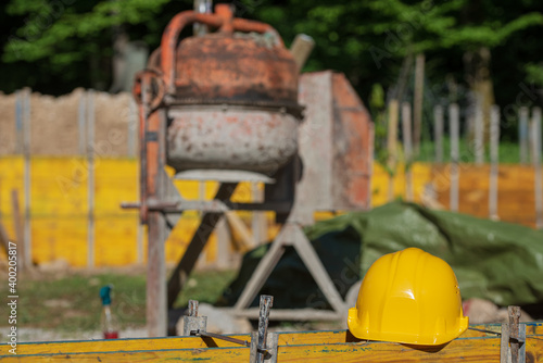 construction, hat, cement, mixer, site, break, nobody, orange, concrete, machine, industrial, industry, equipment, machinery, mix, project, hard hat, framework, cement mixer, tool, construction site, renovation, outside, no people, electric
