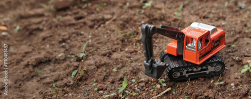 Orange excavator or digger toy excavate on a soil land outdoor. model scale of digger photograp, construction concept.