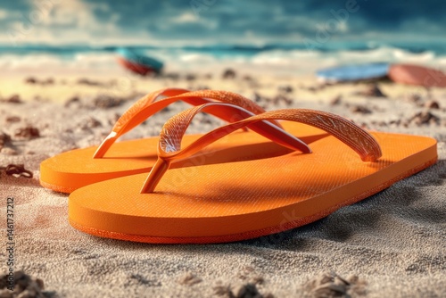 Orange flip-flops on a sandy beach, near the ocean. Close-up view of the footwear on the shore