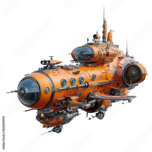 futuristic, orange, submarine, flying, craft, spaceship, vessel, vehicle, aircraft, science fiction, fantasy, technology, modern, design, engine, propulsion, window, hull, detail, complex, large, propeller, antennae, structure, mechanical, detailing, transportation, innovation, exploration, adventure, journey, bizarre, unique, art, rendering, three-dimensional, illustration, concept, space, travel, futurism, alien, science, imagination, flight