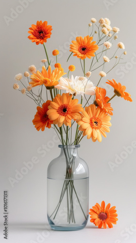 gerbera, daisy, flower, bouquet, floral, orange, yellow, white, green, vase, glasses, clear, water, stem, flower petals, blossom, bloom, spring, summer, nature, beauty, vibrant, colourful, delicate, romantic, elegant, decoration, home decor, interior design, still life, photo, closeup, macro, light, shadow, background, simple, minimalist, fresh, bright, cheerful, happy, joy, love, gift, wedding, birthday, celebration, gratitude