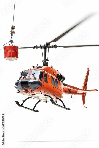 helicopter, aircraft, rotor, orange, red, white, sky, flying, aerial, rescue, bucket, transport, firefighting, water, fire, service, emergency, safety, vehicle, air, flight, transportation, hover, blade, engine, hovercraft, airborne, technology, equipment