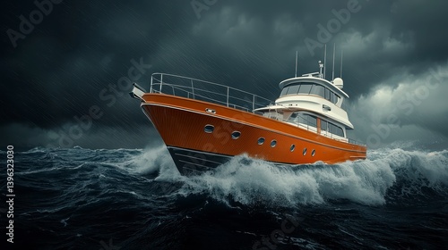 yacht, boat, sea, ocean, storm, wave, dark, cloud, weather, water, vehicle, transportation, travel, adventure, marin, nautical, dramatic, lighting, orange, black, ship, vessel, powerful, dynamic, motion, speed, rough, turbulence, risk, challenge, nature, power, luxury, cruise, sailing, motorboat, craft, heavy, wind, rain, grey, intense, energy, movement