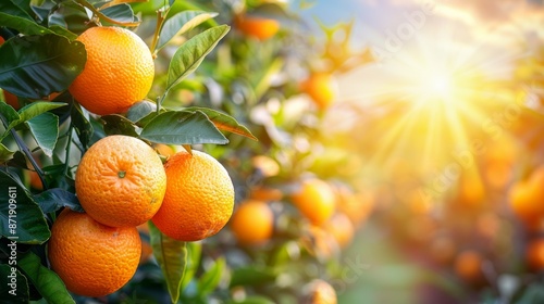 Orange plantation on sunny summer day. Landscape photo. Heathy fresh fruit. Vitamin. Orange grove harvest.