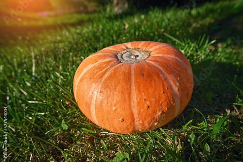 Orange pumpkin on green grass at sunny day. Ripe yellow pumpkin on grass background. Autumn vegetable harvest. Autumn season concept with pumpkin.
