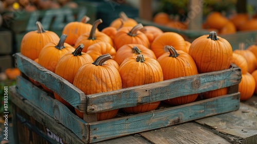 pumpkin, crate, wooden, orange, fall, autumn, harvest, seasonal, farm, agriculture, vegetable, fruit, halloween, decor, rustic, vintage, countryside, nature, food, gourd, vegetable, produce, garden, natural, fresh, organic, healthy, colours, vibrant, texture, pattern, shape, round, stem, leaf, background, closeup, still life, photo