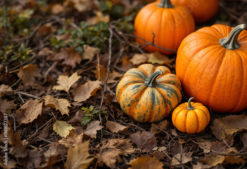 Orange pumpkins on a bed of leaves and twigs, with a rustic, natural background