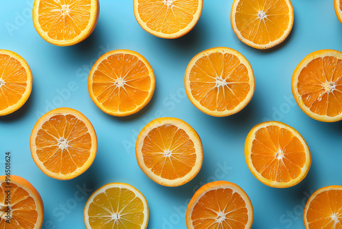 Orange slices and whole orange, shot from above, making a fun pattern on a bright background.