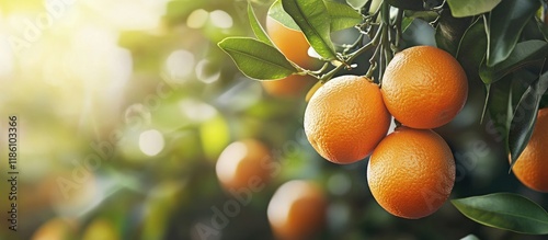 Oranges mature on a branch of a tree Natural backdrop with selective focus and copyspace for text