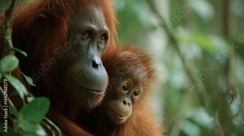 orang, mother, baby, primate, wildlife, rainforest, borneo, sumatra, ape, mammal, endangered species, conservation, animal, nature, jungle, forest, tropical, wild, offspring, furry, orange, cute, adorable, animal portrait, tree, leaf, green, closeup, caring, protection, love, tenderness, eltern, wild animal, animal world, zoology, ecology