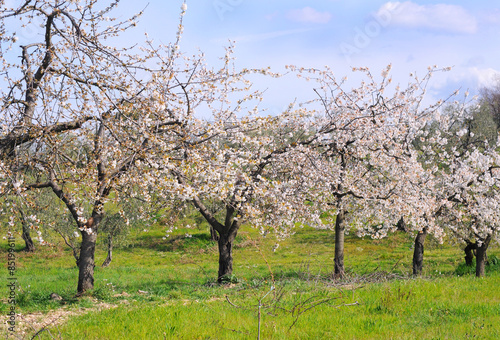 Orchard with cherry trees in bloom, spring in italy, selective focus